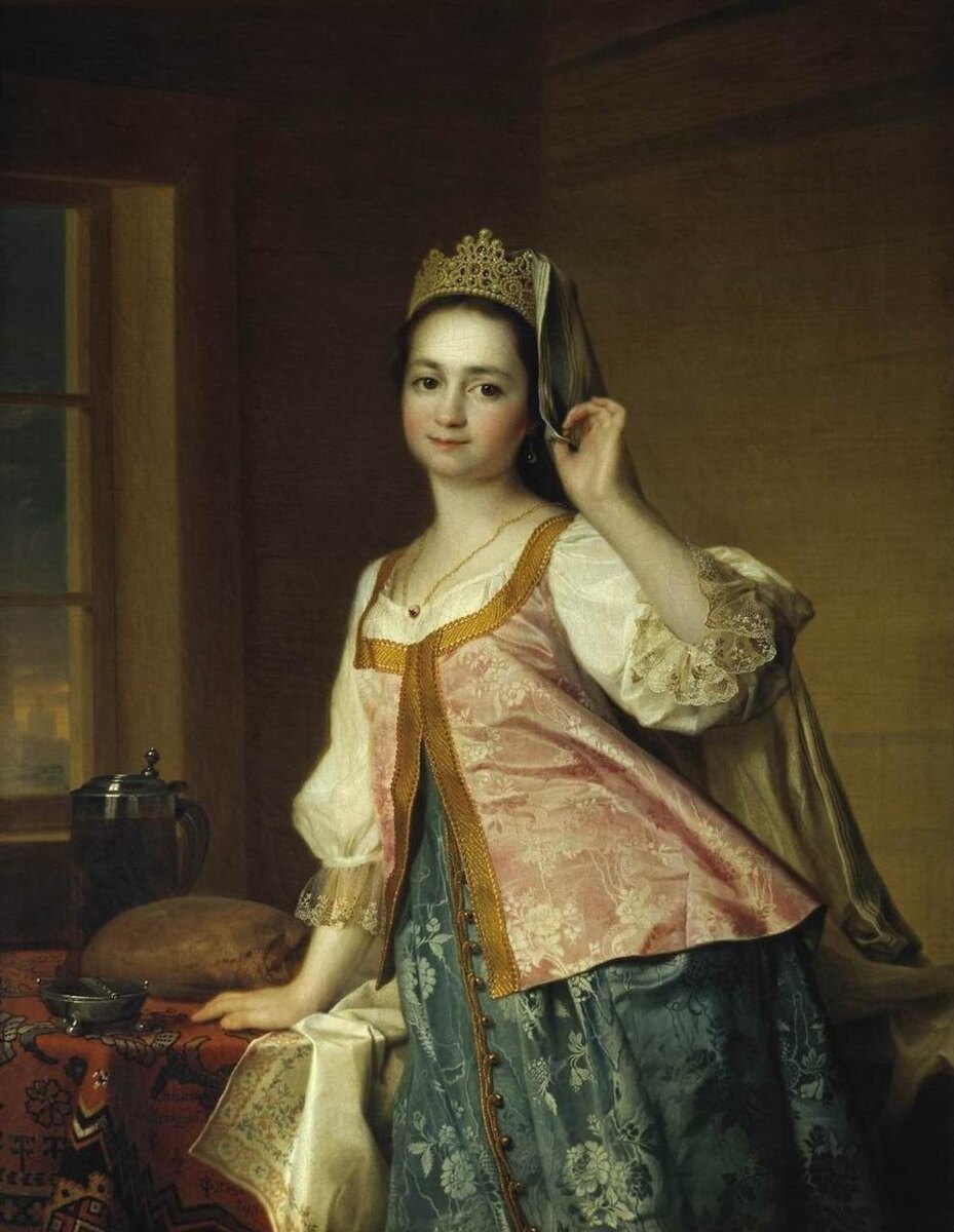 Долгое время считалось, что на ней свадебный наряд крестьянки русского Севера. На самом деле, костюм, включавший шелковые или парчовые сарафан и душегрею, тонкое кружево на рукавах рубахи, кокошник или венец, украшенный жемчугом, шелковое покрывало, во второй половине XVIII века был праздничным образом богатых горожанок. Так тонко и внимательно художник передал все нюансы костюма: фактуру шелковых тканей, особенности традиционного кроя и мельчайшие детали отделки. Любуюсь! «Портрет Агафии Дмитриевны (Агаши) Левицкой», 1783 / Левицкий Д. Г.