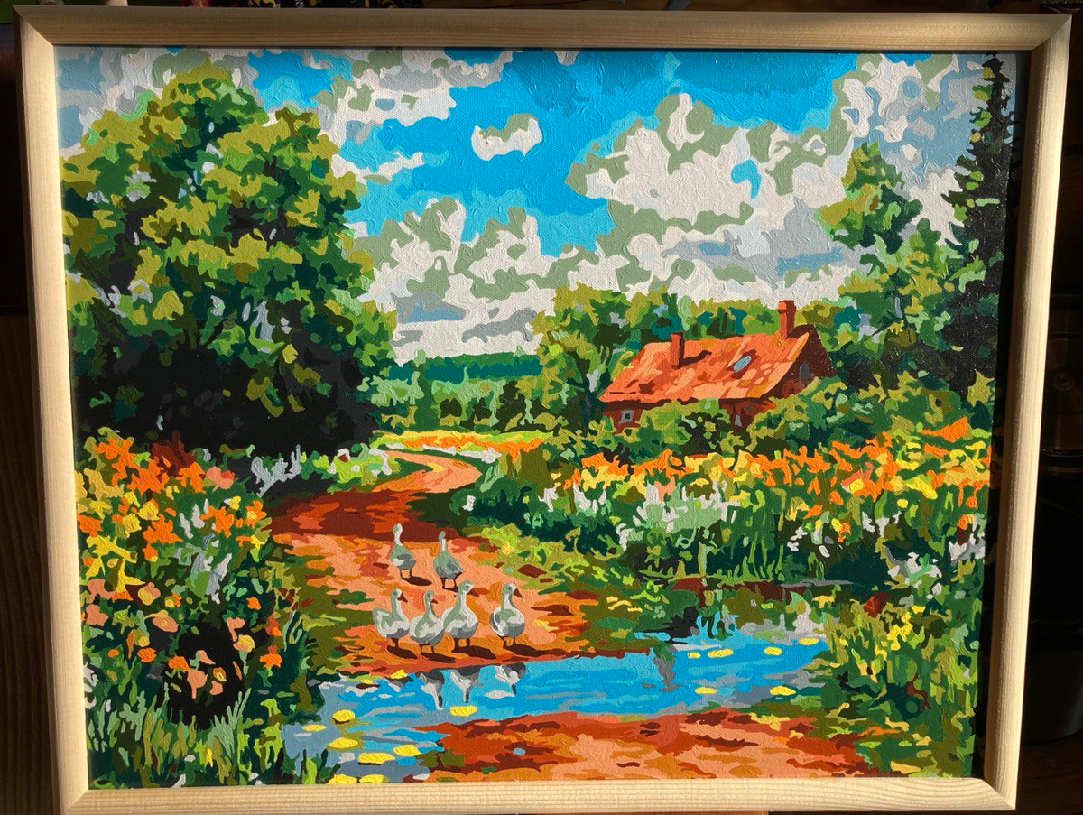 По почте посылку вчера получили Ее нам в огромной коробке вручили Чернилами надпись на ней светилась: Из-за Урала, с приветом, от вашей Кристины, Желаю чтоб Богом вы были хранимы! В посылку вложила Кристина картину, Волшебством и загадкой ее наделила, Совсем пустую мне подарила, И сказала игриво: «рисуй, Катерина!» Отвечала я ей лениво, ворчливо: «Не охота писать картину, Кристина!» А потом, помолилась, за дело взялась, оживилась, Над чистым листом усердно трудилась И чудо свершилось, Ожила та картина, добром осветилась! Хитро мигнул мне с ожившей картины Глаз голубой доброй Кристины, Летним озером притаился, В цветах затерялся и в ирисах скрылся. На диву поле зеленое заколосилось, Гуси-лебеди на картине той появились. В бревенчатый дом гуси спешили, В тот, что живет возле ели, осины, А вдали шелестели дубы, да рябины Под небом кудрявым друг друга любили! Вот такое чудо свершилось На чистом листе история жизни моей отразилась!