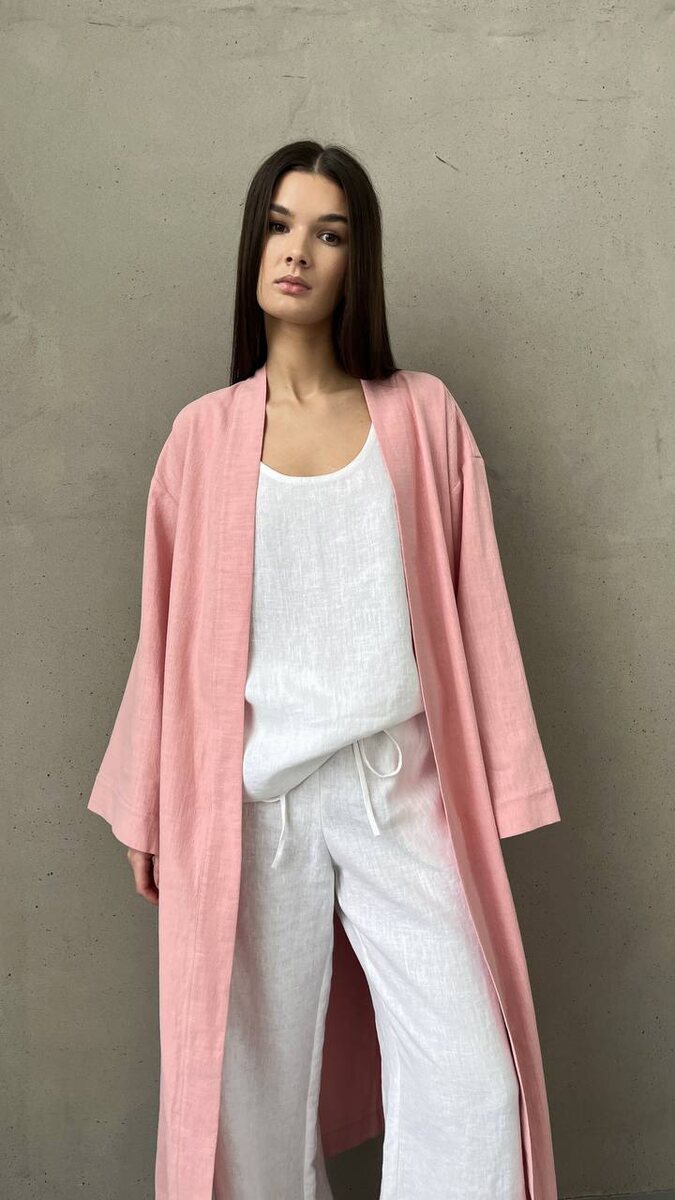 Длинное кимоно из натуральной крапивной ткани в нежном розовом оттенке. Ткань более плотная и формодержащая, чем лен, при этом такая же мягкая и приятная к телу🌿