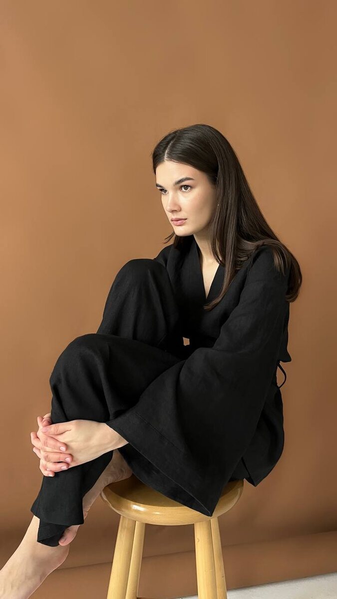 Расслабленный и лаконичный комплект из умягченного льна в черном цвете. Жакет в стиле кимоно с широкими рукавами и поясом в комплекте. Прямые брюки свободного кроя на на мягком эластичном поясе.