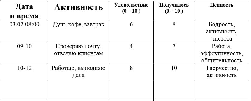 5 столбец - Ценности - для чего была нужна вам эта деятельность, что она привнесла в вашу жизнь. Так мы преодолеваем чувство бессмысленности и пустоты, наполняем планер еще и важностями.
