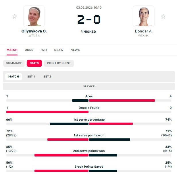 ⚡ Олейникова обыграла Бондарь в Клуж-Напоке со счетом 6-4, 6-4