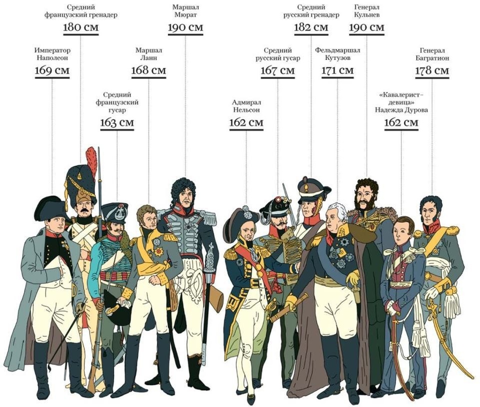 Итак, рост императора французов – между 168 и 169 см, а средний рост в русской и французской армиях – 160-165 см. Конечно, представители некоторых родов войск, где нужен был большой рост, рядом со своим императором казались великанами. Кроме того, некоторые маршалы Наполеона были высокими мужчинами. Например, его зять, неаполитанский король Иоахим Мюрат – 190 см. Да и Александр I, тильзитский визави Наполеона, был высоким по меркам того времени - 178 см.