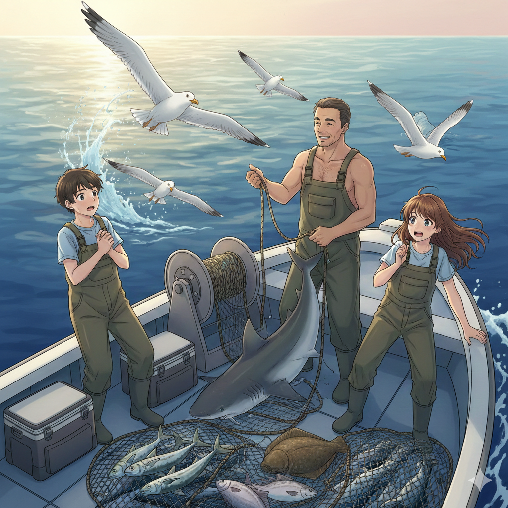 Вдруг в сети появилась огромная рыба. Рыбак бросил чистить рыбу и сам подошел к катушке. Катя не сразу поняла, что это за рыба. Только когда огромная выше ее роста тушка упала на дно лодки, Катя поняла, что это акула! Катя читала в интернете, что в Адриатическом море нет серых акул, только голубые, которые безобидные. Но это была самая настоящая серая акула! Она была уже не живая, но Кате все ровно было не по себе. Богдан тут же достал ее, взял за хвост. Рыбина была размером с него.
