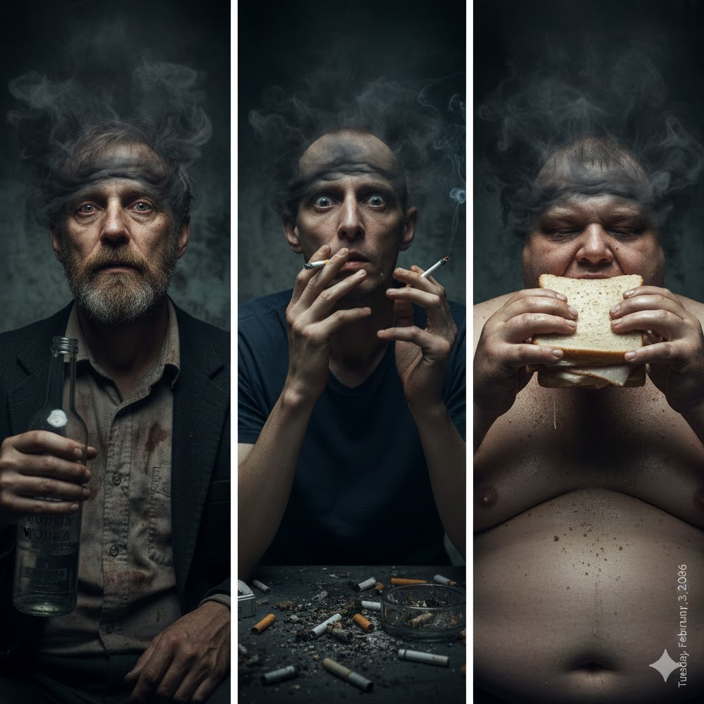 Утро. Тревога. Мысль: «Надо догнать конкурентов, запустить новую рекламную кампанию». Мозг тут же оценивает усилие: «Слишком сложно, долго, риск провала». Требует дофамина для облегчения боли. Алексей закуривает. Через 7 секунд — искусственная волна «релакса» и псевдо-ясности. Мозг доволен: цель достигнута без труда. Через час стресс возвращается. Мозг уже не предлагает работать. Он шепчет: «Ещё сигарету. Или пива». К вечеру Алексей вымотан, раздражён, не сделал главного. Кошелёк пуст, перспектив нет. Он ненавидит себя и… снова тянется за сигаретой. Завтра — то же самое. Это — биоробот с испорченной программой.
