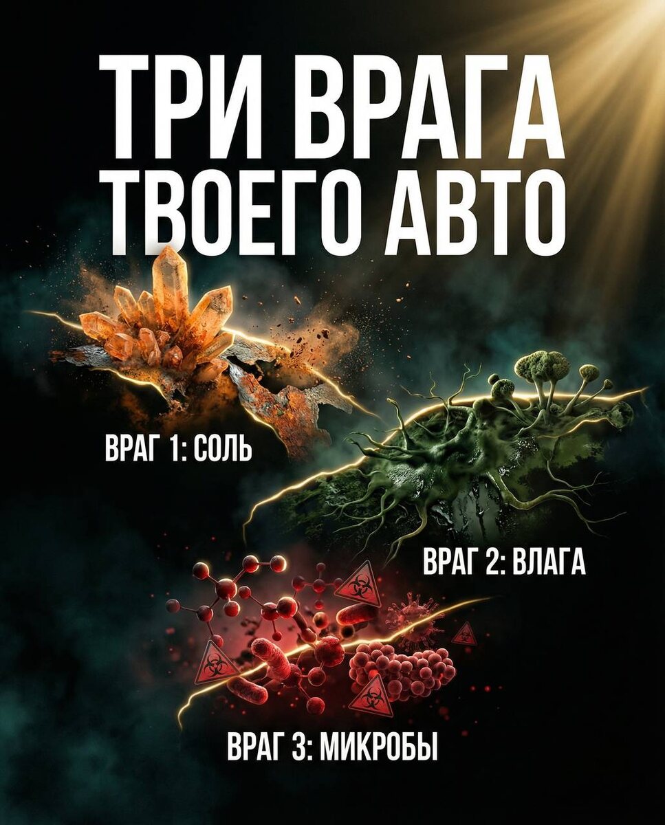 ВРАГ 1: СОЛЬ И РЕАГЕНТЫ 🧂 Все эти хлориды и химия с дороги остаются в салоне. Заносишь с ботинок соль и снег, включаешь печку — всё тает и остаётся в салоне. Если воды много, она протекает в коврик, затем под ковролин, где находятся металл и электрика. ВРАГ 2: ВЛАГА 💧 Мокрый салон + теплота = идеальные условия для плесени. Появляется вонь, пятна, в салоне запах. Это вредит вашему здоровью — вы этим дышите. ВРАГ 3: МИКРОБЫ И БАКТЕРИИ 🦠 Размножаются в мокром салоне как на дрожжах. Система вентиляции становится рассадником инфекции. Кашель, аллергия, простуды — всё это результат. ПЛАН СПАСЕНИЯ: ✅ Химчистка раз в 6 месяцев ✅ Обязательная сушка салона ✅ Озонирование салона (убивает все микробы и запахи) БЕЗ УХОДА: → Через время: вонь и запах, стекла постоянно запотевают, микробы и бактерии, вся эта каша остаётся в салоне. С ПРАВИЛЬНЫМ УХОДОМ: → Химчистка раз в 6 месяцев с озонацией салона и полной сушкой. Сохрани себе эту информацию! Поделись с друзьями. Готов привести в порядок салон?