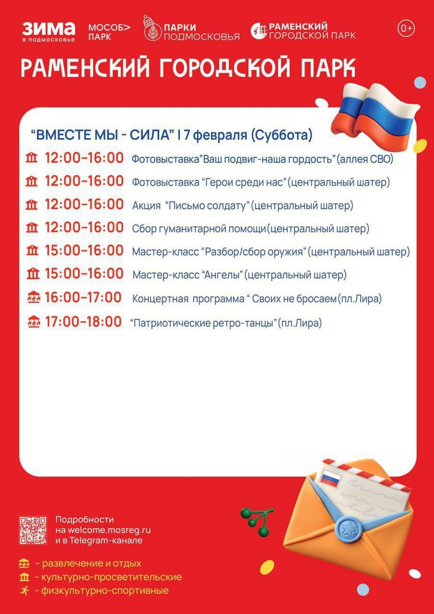 ! В преддверии Дня защитника Отечества, предлагаем вам программу мероприятий в Раменском городском парке. ➡️Фотовыставка «Ваш подвиг — наша гордость» ✔️Погрузитесь в историю через объектив камеры! Увидите снимки людей, чьи подвиги навсегда останутся в нашей памяти.🩵 ⭐️Место: Центральный шатёр. ➡️Фотовыставка «Герои среди нас» ✅Узнайте о настоящих героях среди нас! Каждая фотография — рассказ о силе духа, доброте и подвиге. ⭐️Место: Центральный шатёр. ➡️Акция «Письмо солдату» ♥️Подарите бойцу частичку тепла и заботы — напишите ему письмо со словами поддержки. 📎Место: Центральный шатёр. Сбор гуманитарной помощи ✅Ваш вклад имеет значение! Присоединяйтесь к сбору — вместе мы сможем помочь нашим бойцам. 📎Место: пункт сбора в Центральном шатре. ➡️Мастер‑классы: ✅«Сбор/разбор оружия»; «Ангелы». 📎Место: Центральный шатёр. ➡️С 16:00 на площадке «Лира» пройдет: ✅концертная программа «Своих не бросаем»; ✅патриотическая ретродискотека. Не упустите шанс стать частью значимых событий! #