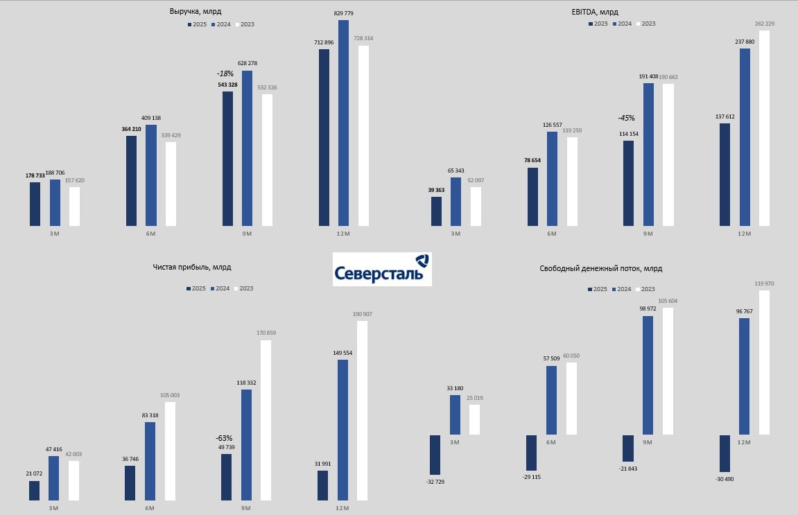 Всё стабильно. Всё плохо. 🔽 Выручка: 712,90 млрд руб. (-14% г/г) 🔽 EBITDA: 137 млрд руб. (-42% г/г) 🔽 Рентабельность EBITDA: 19% 🔽 Свободный денежный поток: -30,5 млрд руб. 🔽 Чистая прибыль 32 млрд ( -79% г/г) 📌Цены на сталь и спрос не радуют сталеваров 2025 год оказался сложным для российской и мировой металлургической отрасли. Кризисные тенденции продолжили нарастать. Затяжной кризис на рынке недвижимости КНР привел к тому, что экспорт стали из Китая за весь год вырос на 7,5% по сравнению с предыдущим годом, достигнув исторического максимума в 119,02 млн тонн. Это оказывает давление на цены во многих регионах мира. Одновременно с этим спрос на сталь в России существенно снизился вслед за охлаждением экономики на фоне высокой ключевой ставки. Потребление стали в РФ снизилось примерно на 14% г/г, при этом замедление активности наблюдалось во всех ключевых отраслях потребителях. Падение спроса привело к снижению цен на металлопродукцию в 2025 году Что стоит отметить? 📌От