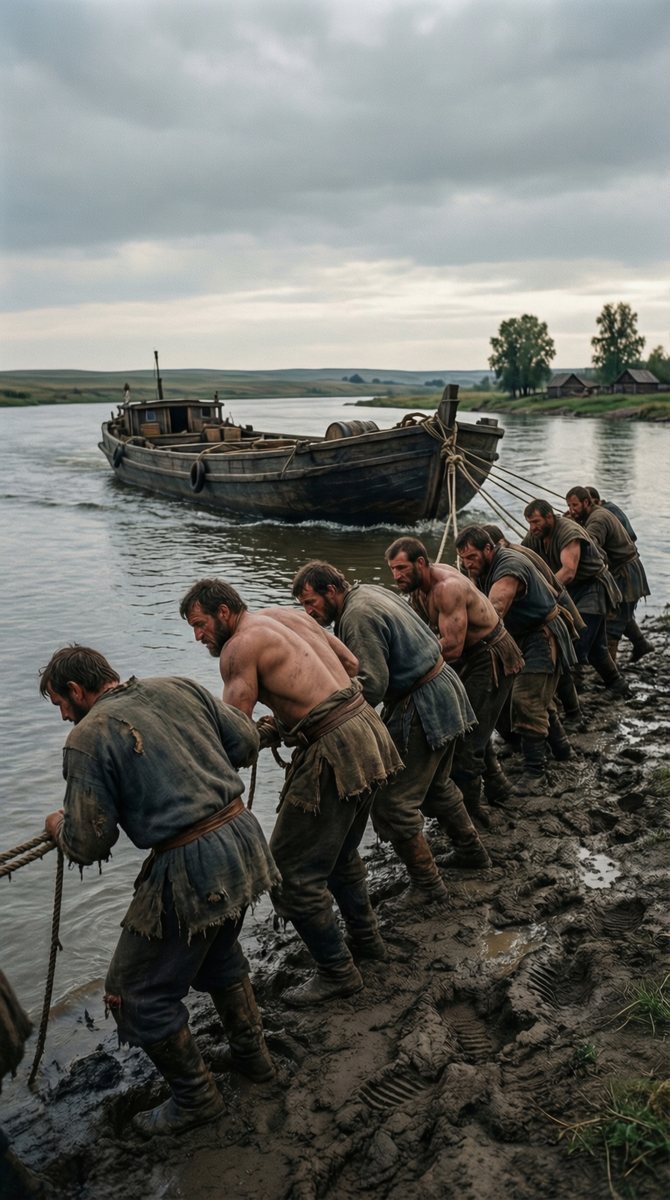 Представьте: баржа гружена зерном, солью, рыбой или другими товарами. Течение Волги — мощное, особенно весной. Чтобы подняться вверх по реке, нужна огромная сила. Лошади здесь бесполезны — берега часто заболочены, обрывисты или покрыты густым кустарником. Остаются только люди.