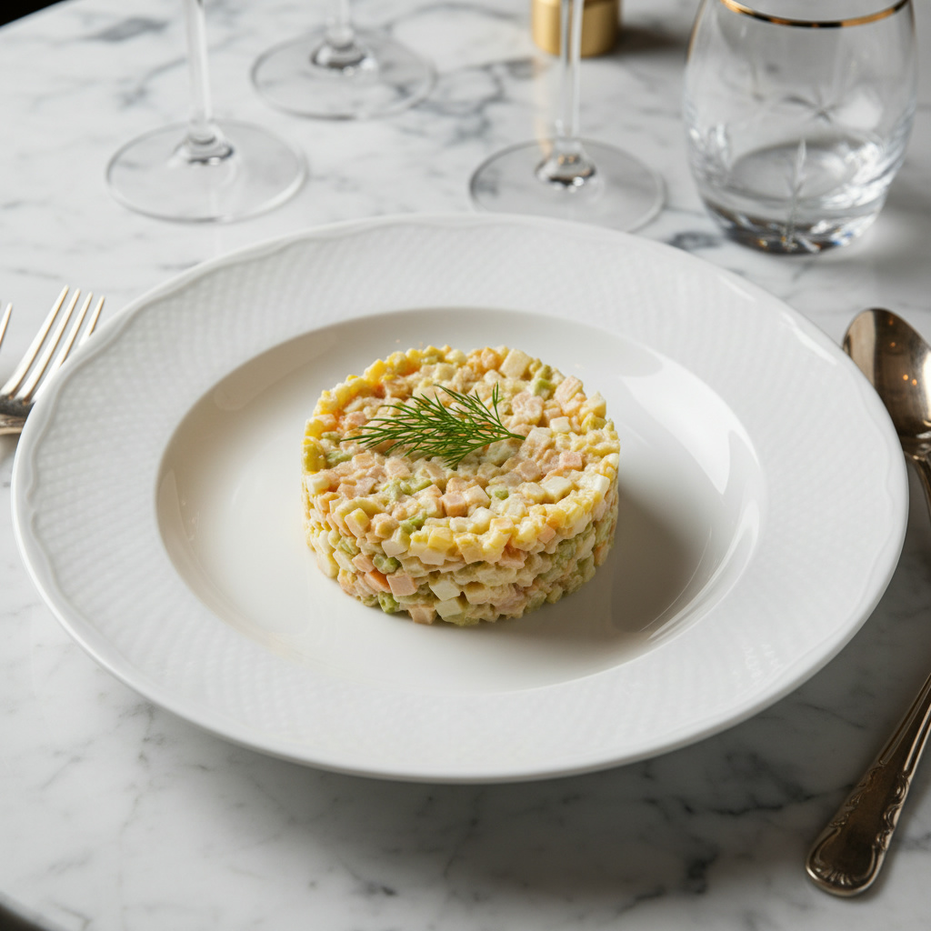 Второе — температура подачи. Ресторанный оливье всегда охлаждённый, но не ледяной. Оптимальная температура — 8-10 градусов. При такой температуре вкусы раскрываются полностью, а майонез сохраняет кремовую текстуру.