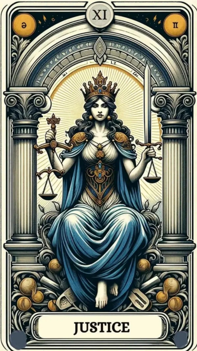 Связь с арканом «Справедливость»: Это не просто земной закон. Это Высший, Кармический Закон. Аркан «Справедливость» требует жить в абсолютной честности с собой и другими, взвешивать свои решения и нести за них полную ответственность. Для Одиннадцатки это означает: ваша жизнь — это демонстрация духовных законов через свои действия и идеи. Вы призваны быть живым воплощением справедливости, баланса и истины.