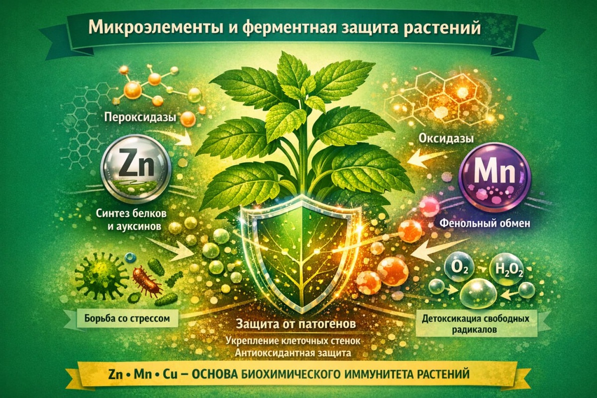В системе защиты растений микроэлементы часто воспринимаются как «вспомогательные». Но с точки зрения физиологии это некорректно. Именно микроэлементы запускают и поддерживают ферментные системы, на которых держится биохимический иммунитет растения. В этом смысле питание и защита - одно и то же, просто на разных уровнях. Ключевую роль здесь играют цинк, марганец и медь. Цинк (Zn) напрямую участвует в синтезе ауксинов и белков. При его достатке нормально формируются меристемы, поддерживается рост молодых тканей и стабильная работа ферментов, отвечающих за регуляцию стресса. Дефицит Zn приводит к нарушению белкового обмена и снижает способность растения быстро реагировать на инфекцию. Марганец (Mn) - центральный элемент фенольного обмена. Он необходим для работы ферментов, участвующих в синтезе фенольных соединений и лигниноподобных структур. Эти вещества выполняют сразу две функции: укрепляют клеточные стенки и обладают прямым антимикробным действием. При дефиците Mn фенольная защита