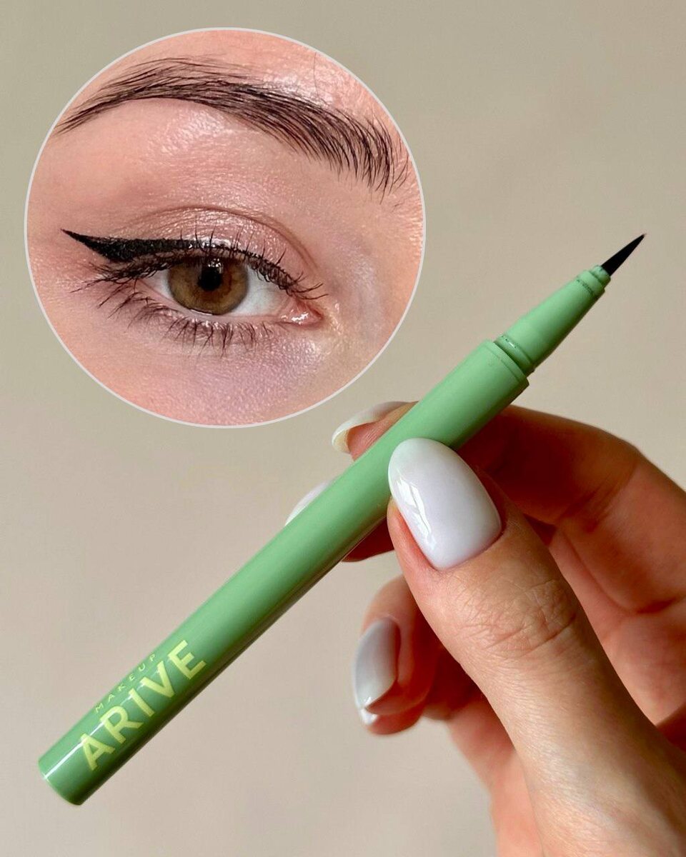 Я уже привыкла видеть у Arive makeup классные недорогие продукты, поэтому решила собрать в одну статью и старых любимчиков, и новинки. Те, кто со мной давно, знает, что я люблю их подводку для глаз в виде фломастера. С нее и начну. Eyeliner Pen с фетровым наконечником позволяет нарисовать стрелки любой толщины: от аккуратных микрострелочек до толстых драматичных. Я пробовала и черную, и коричневую. Могу отметить, что коричневая более водянистая — чтобы получить насыщенный цвет нужно обвести стрелку 2 раза. А черная сразу ложится плотным слоем. Держится весь день и не течет, поэтому я ее использую постоянно. Balm Lipstick — комфортная увлажняющая помада. Она приятно ощущается на губах, не сушит, не подчеркивает шелушения. Стойкость средняя: после еды и напитков нужно поправлять. Мне нравится такое на повседневку, поэтому обзавелась двумя оттенками. На первом фото розовый оттенок 07. А тут оттенок 08 "Черный чай". Он уже отдает коричневым, делает губы темнее. Duo Blush Stick Soft Matte