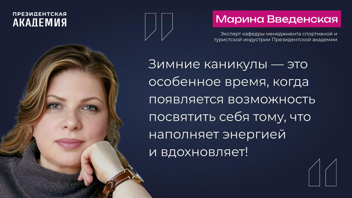 Советы от Марины Введенской, к.э.н., эксперта кафедры менеджмента спортивной и туристской индустрии Президентской академии: «Когда вы в последний раз позволяли себе сделать что-то исключительно для собственного удовольствия и внутренней гармонии? Не ради того, чтобы порадовать родителей, угодить друзьям или соответствовать чьим-то ожиданиям, а именно для себя — просто потому, что этого хочется именно вам, потому что это приносит радость лично вам». В суете забот и ежедневных дел собственные желания часто оказываются на втором плане, и со временем мы можем перестать слышать голос своей души. Но забота о себе — это не эгоизм, а признание своей ценности и важности собственных потребностей. Позволять себе маленькие радости, выбирать то, что дарит внутренний комфорт, — значит поддерживать себя и создавать прочный фундамент для будущих побед. Именно в такие моменты рождается внутренний ресурс, который помогает двигаться к новым целям и реализовывать самые смелые мечты. Зимние каникулы — осо