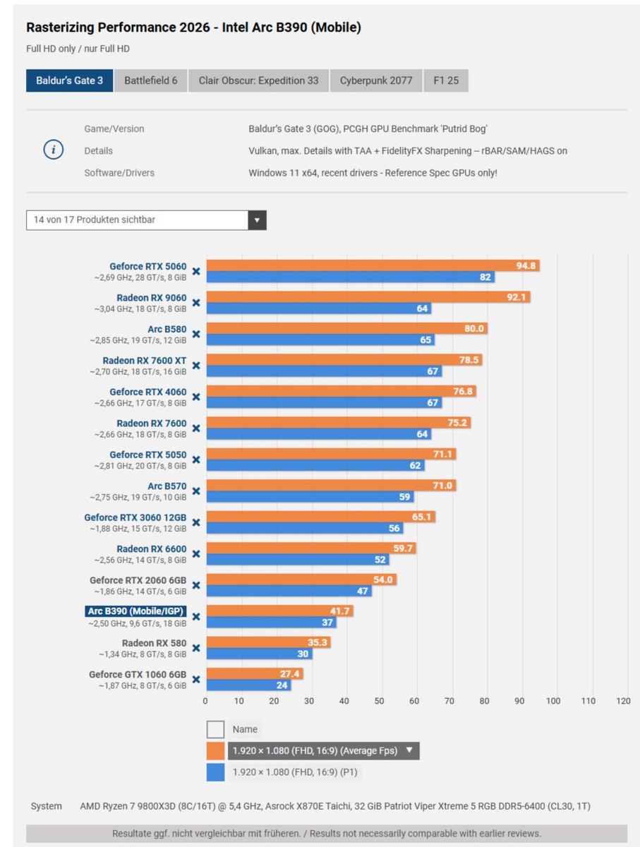 PCGamesHardware сравнили топовую встройку Intel Arc B390 с бюджетными дискретными GPU в играх при разрешении 1080p