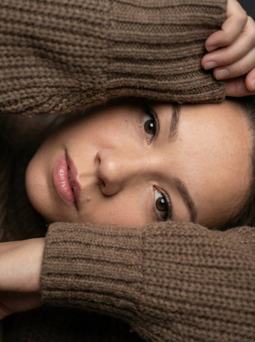 👇🏻 🌟Переходим на удобный сервис для генерации: Ссылка 👉 Syntx Ai Ссылка 👉 Veo3 📌ИНСТРУКЦИЯ ПО ИСПОЛЬЗОВАНИЮ В ЗАКРЕПЛЕННЫХ СООБЩЕНИЯХ ◾️ПРОМТ : Создай портрет , не меняя черты лица. Крупный план (extreme close-up) лица молодой женщины, ракурс сверху , она рукавами от обьемной коричневой крупной вязки кофты обрамляет лицо, выглядывающей сквозь узкую горизонтальную щель. Глубокие карие глаза с детальной прорисовкой радужки, влажный блеск на губах естественного розового оттенка. Мягкое студийное освещение, создающее плавные тени на коже. Безупречная текстура кожи, естественный макияж. Атмосфера таинственности и элегантности, высокая детализация, гиперреализм, объектив 85mm. Кинематографичный свет, глубина резкости, высокое разрешение.