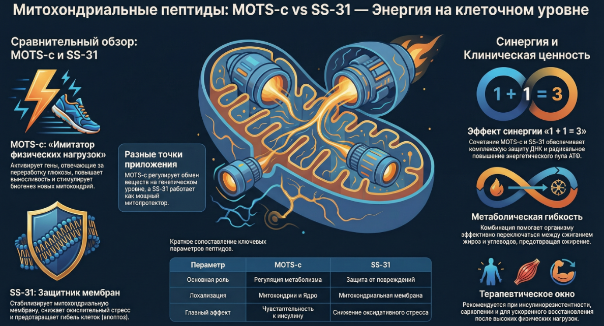 Этот пептид является уникальным регулятором, который кодируется непосредственно в митохондриях (геном 12S рРНК) и действует как сигнальная молекула для адаптации организма к стрессу. Этот пептид относится к группе таргетных регуляторов и действует преимущественно как защитник и восстановитель энергетического потенциала. Наиболее мощный результат достигается при совместном использовании этих пептидов. Формула синергизма «1 + 1 = 3» описывает комбинацию MOTS-c + SS-31, которая дает кратный эффект в восстановлении обмена веществ и клеточной энергии. Часто в anti-age протоколах к этой паре добавляют NAD+ (НАД+) для создания полноценной «триады энергии», восстанавливающей митохондриальный пул и защищающей ДНК. При совместном применении MOTS-c активирует создание новых качественных митохондрий, а SS-31 защищает их от повреждений в процессе работы. Подпишись на мой канал в Дзене Получить консультацию по пептидам https://taplink.cc/annymalysh