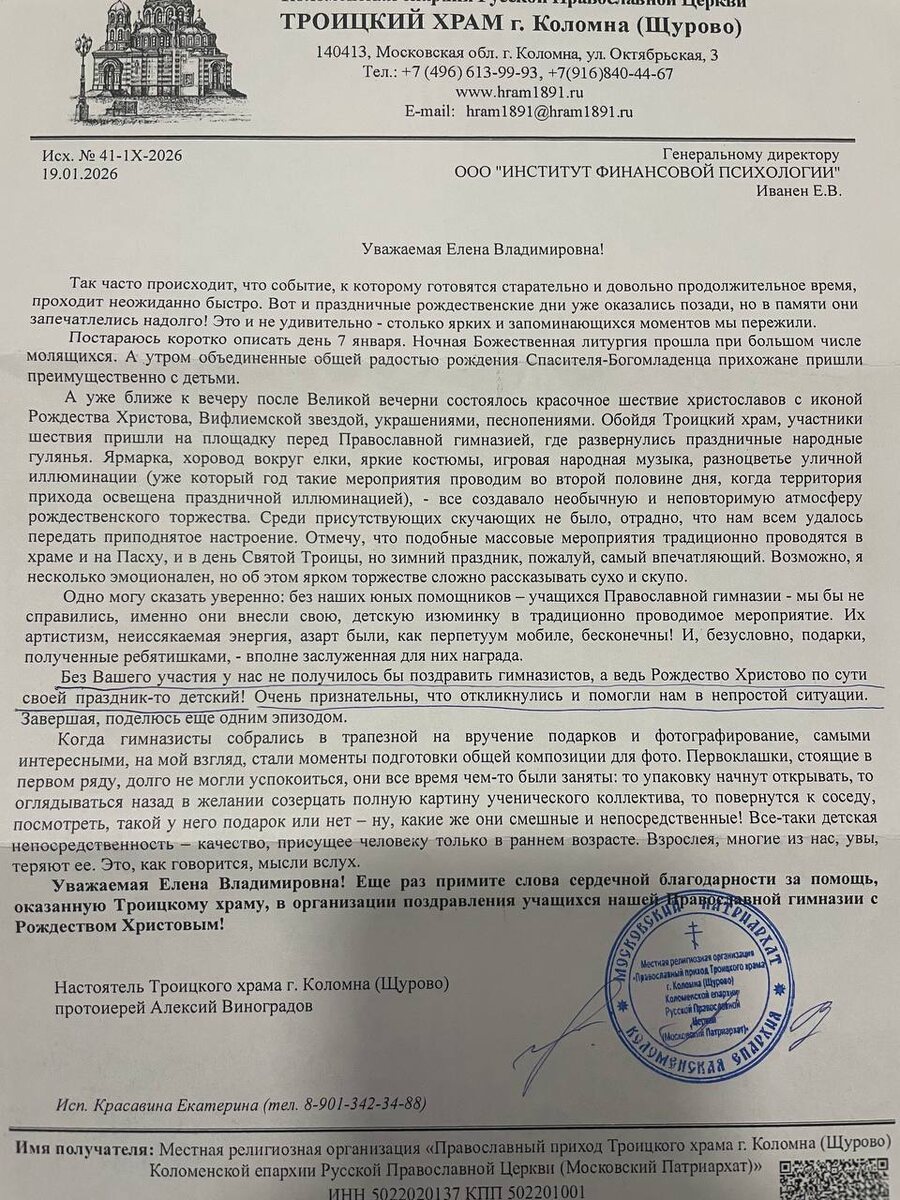 С 1 по 3 января в рамках Института финансовой психологии проходил Новогодний благотворительный Марафон (подробности здесь) К Елене Владимировне, ректору Института финансовой психологии обратился настоятель Троицкого храма г.Коломны протоиерей Алексий Виноградов с просьбой помочь собрать деньги на рождественские подарки для детей Православной гимназии, которая открыта при храме. Гимназия существует на пожертвования, не имеет государственной поддержки, и отдельных денег на подарки для ребят не было. Многие дети из многодетных и малообеспеченных семей, поэтому так важно было помочь в этом благом деле. Благодаря вашей помощи нам удалось собрать более 14 т рублей и отправить их на подарки для деток 🎁 На днях от отца Алексия пришло письмо с благодарностью. (См фото) А Елена Владимировна благодарит каждого, кто принял участие в этом сборе❤️ От своего имени благодарю вас за ваши добрые сердца и вклад в детскую радость❤️ Благодарю каждого благотворителя поименно: Ирина, Ирина, Ирина, Д