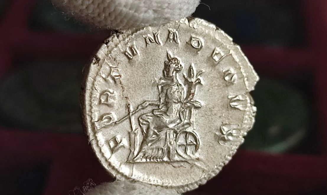 Показываю вам серебряную монету. Античную! Двойной денарий, называется «антониниан». На аверсе - юный император Гордиан III в лучевой короне. На реверсе - женщина на троне. В руках у неё корабельный руль и рог изобилия. Логично, понятно, классика. Но стоп. А это что под троном? Ба, да это же колесо!
