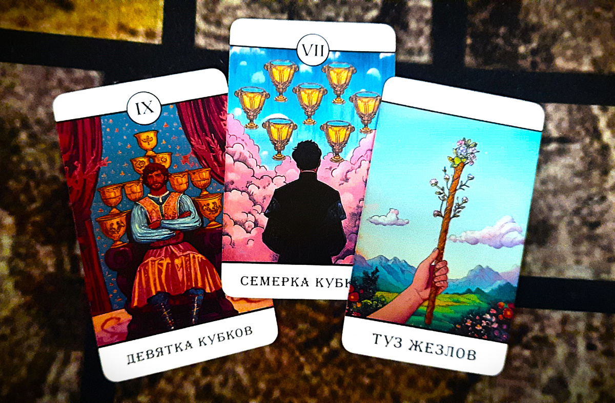 В совокупности эти три карты создают яркую картину насыщенных и позитивных событий. Девятка Кубков обещает вам радость и исполнение желаний, Семерка Кубков дарит множество интересных возможностей на выбор, а Туз Жезлов придает сил для активных действий.