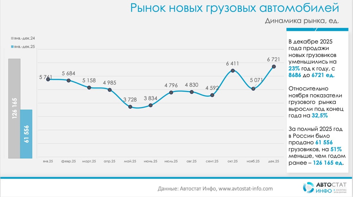 По данным аналитики «Автостат Инфо», в 2025 году рынок новых грузовых автомобилей в России испытал жесткую коррекцию. За год было продано 61 556 грузовиков против 126 165 единиц годом ранее, то есть рынок фактически сократился наполовину. Декабрь, традиционно один из ключевых месяцев для рынка коммерческой техники, тоже отработал слабее. В последний месяц года был продан 6 721 автомобиль против 8 686 в декабре 2024 года, то есть -23 % год к году. При этом к ноябрю наблюдается заметный технический отскок: продажи выросли с 5 071 до 6 721 единицы (+32,5 %), что говорит о попытке бизнеса «дотянуть» год и закрыть отложенные закупки. Помесячная динамика хорошо иллюстрирует нервный характер спроса. После относительно ровного старта года (январь–март в диапазоне 5,1–5,8 тыс. машин) рынок ушел в просадку. За май и июнь фиксировались минимум около 3,7–3,8 тыс. грузовиков. Далее следует волнообразное восстановление летом и в начале осени, пик приходятся на октябрь (6 411 шт.), затем краткосрочн