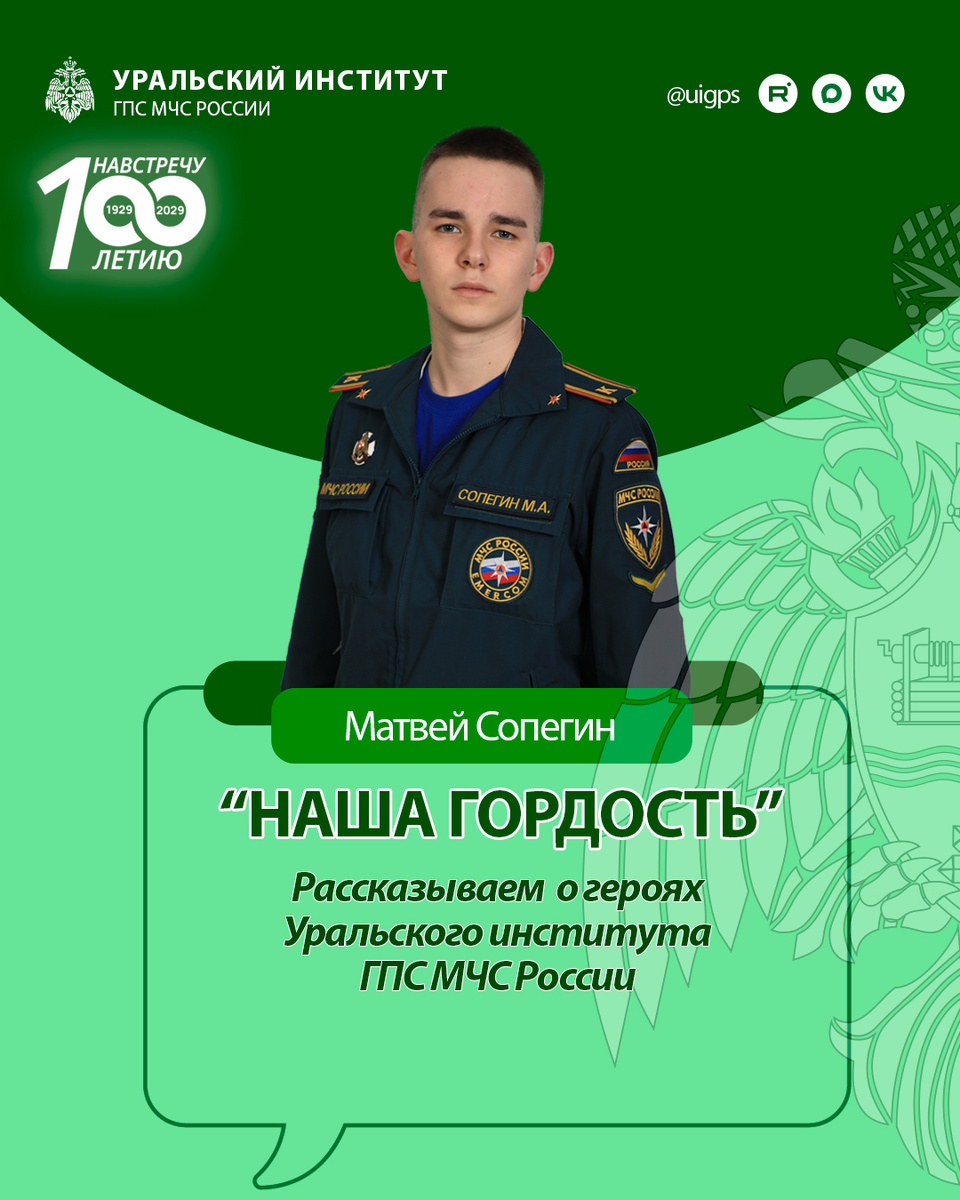 История о курсанте 1-го курса факультета пожарной и техносферной безопасности Уральского института ГПС МЧС России Матвее Сопегине, который начал свой путь в пожарной охране 18 ноября 2024 года, поступив на службу пожарным в 305 пожарно-спасательную часть 1 ПСО ФПС Главного управления МЧС России по Свердловской области. За это время он успешно прошёл стажировку и начальную профессиональную подготовку, получил допуск к самостоятельной работе по должности пожарного, после чего состоялся его первый выезд на пожар. Осознанное желание связать жизнь со структурой МЧС России пришло с опытом. Важную роль в этом выборе сыграла семейная династия: отец Матвея, Александр Сопегин, — начальник караула 105 пожарно-спасательной части 1 ПСО ФПС Главного управления МЧС России по Свердловской области, а дядя Николай Сопегин также служит в 105 ПСЧ водителем автолестницы. Но главная причина — это искреннее стремление помогать людям, протянуть руку помощи в трудный момент. Помимо службы, Матвей уделяет внима