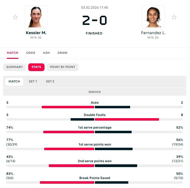 ⚡ В Абу-Даби во втором круге турнира Кесслер обыграла Фернандес со счетом 6-3, 6-2.