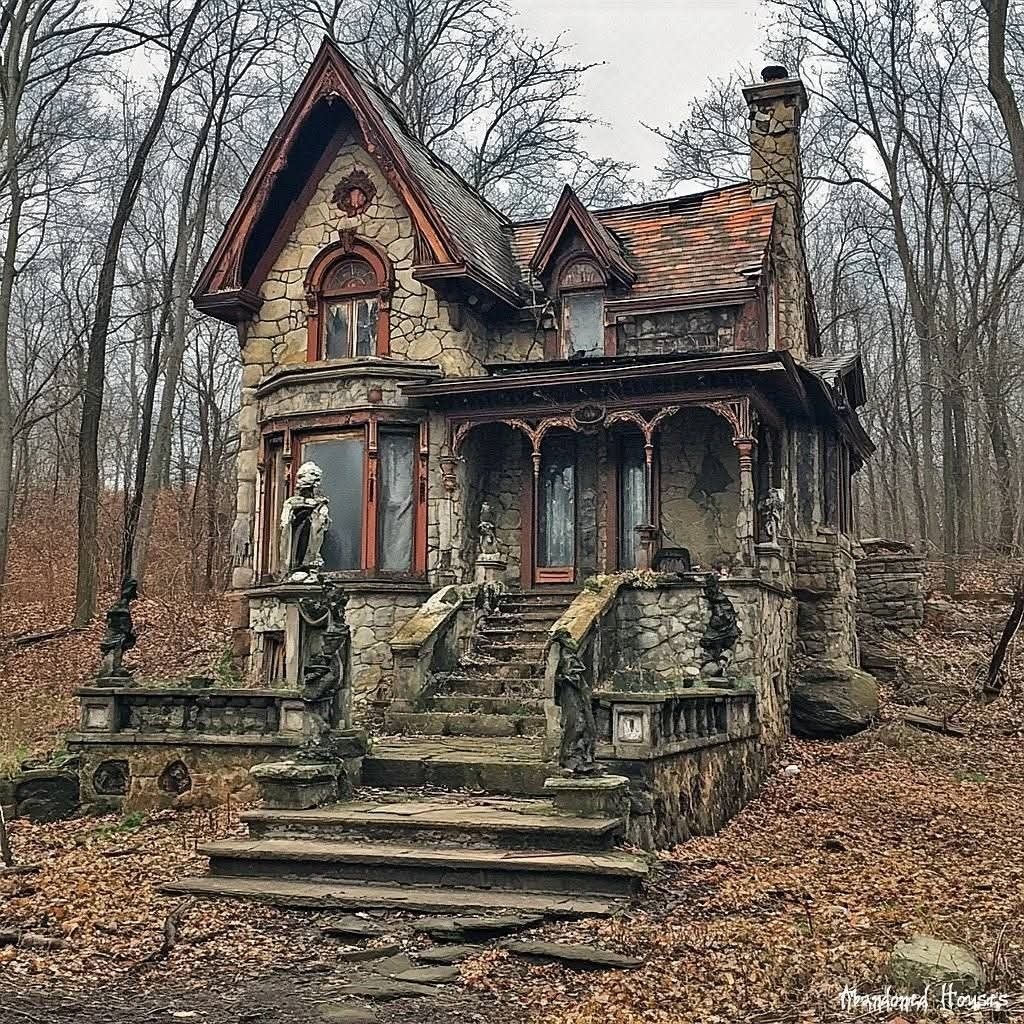 Перед вами — словно иллюстрация из готической сказки: старинный особняк, затерянный среди голых деревьев осеннего леса. Его каменные стены хранят эхо былых времён, а резные детали фасада будто рассказывают свою историю.