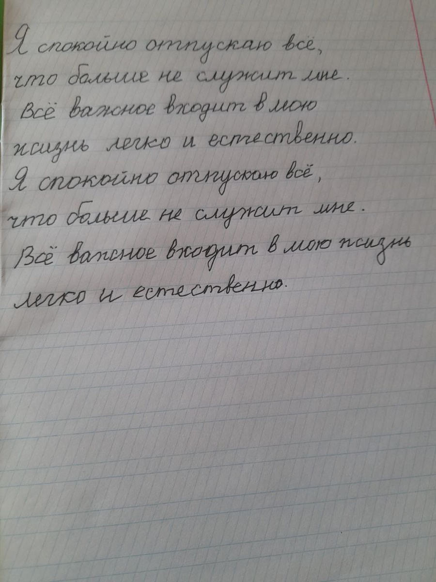 В интернете продаётся множество разных прописей для взрослых. Проще, купить тетрадь в линейку с наклоном и писать не те аффермации, которые вам предлагают в прописях, а любые, которые нравятся вам. Мне подошли прописи в частый наклон. Давно не писала под наклоном, пока получается не очень. Но думаю, что принцип вам понятен. Прописи не только усиливают аффермацию (внушение дня), но и координацию движений, тонкую моторику, фокусировку на деталях, долгосрочная координация, запоминание форм и структур, ритмическое восприятие, медитативный и терапевтические эффекты для снятия напряжения, сосредоточенности.