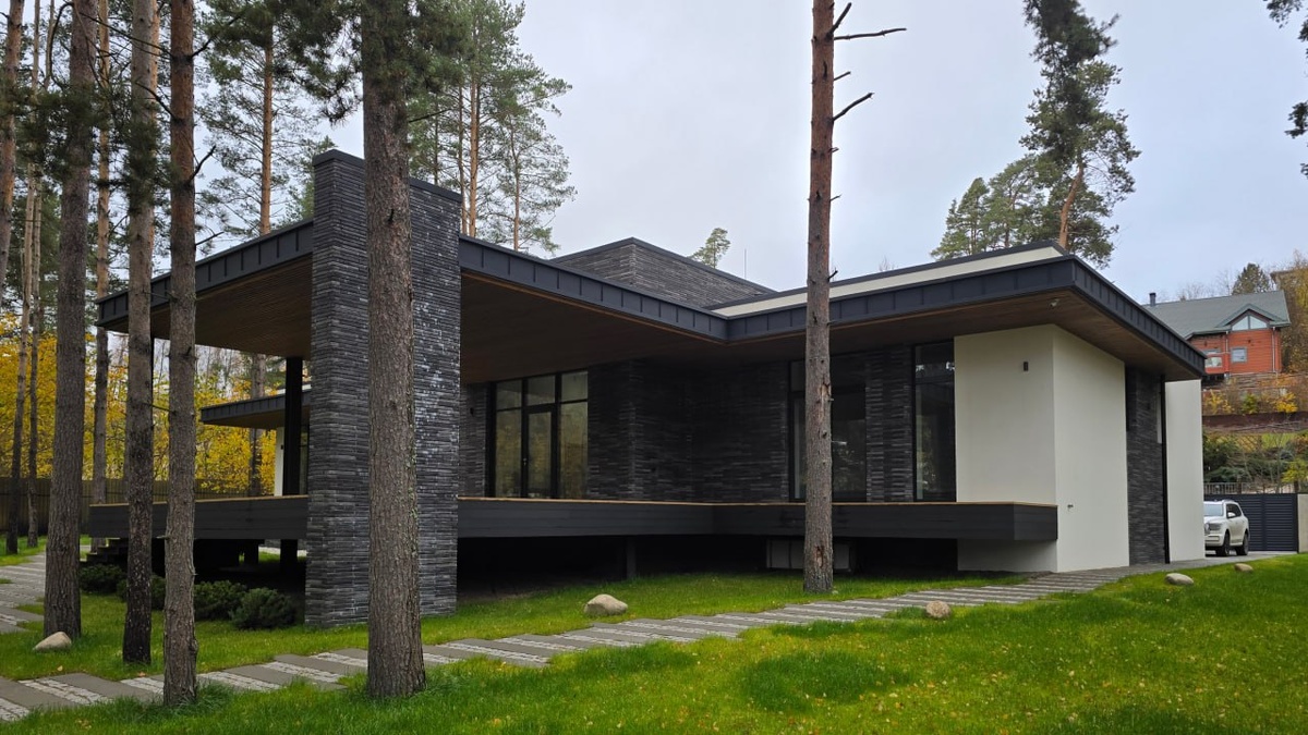 На участке разместились одноэтажный дом из теплой керамики и баня из газобетона - в едином архитектурном стиле. В прошлом году был завершен полный внешний облик участка, включая ландшафт. Общая площадь дома: 312 м² Площадь террасы: 105 м² ▫️В отделке фасада сочетание клинкерного кирпича, планкена из термососны, штукатурки и фальца. ▫️Подсветка карнизных свесов по всему периметру дополняет внешний вид фасада и особенно эффектно выглядит в ночное время. Каждый проект мы создаём под вас с учётом архитектурных требований посёлка, географии участка и вашего образа жизни. Подробнее о проекте #Золотыепески_monolithouse