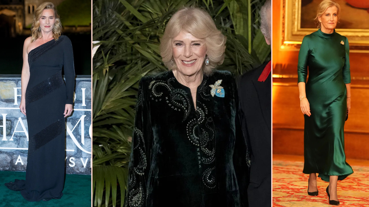 Как и следовало ожидать, члены королевской семьи надели свои лучшие наряды для этого торжественного мероприятия. Королева Камилла была одета с иголочки в бархатное платье от Anna Valentine, украшенное узорами в стиле пейсли. Кольцо королевы принадлежало Royal Collection Trust, а на запястье блестел драгоценный винтажный браслет Alhambra от Van Cleef and Arpels. В качестве аксессуаров Ее Величество надела бирюзовые серьги с бриллиантами, которые она надевала на 50-летие Чарльза в Хайгрове и на свой первый дипломатический прием в Букингемском дворце после свадьбы с будущим королем в 2005 году. Обычно королева носит эти серьги с бирюзовым колье, подаренным ей отцом, майором Брюсом Шэндом.