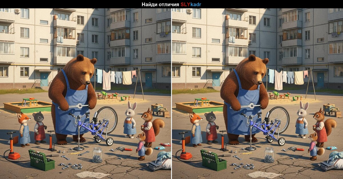 Перед вами уютная сцена во дворе: мишка чинит велосипед, а маленькие помощники внимательно следят за работой. Но не всё так просто… 🧐