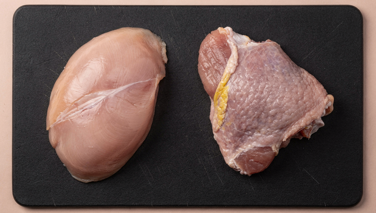 Грудка и бедро - два куска одной курицы, но в тарелке они ведут себя совершенно по-разному. Куриная грудка давно стала символом "правильного питания". Бедро - её менее популярный конкурент, которому достается роль "жирного компромисса". Но если разложить оба куска по цифрам, картина получается интереснее, чем просто "грудка лучше". По данным базы USDA (Министерства сельского хозяйства Соединенных Штатов Америки), 100 г куриной грудки без кожи содержат около 106 ккал, 23 г белка и 1,2 г жира. Те же 100 г бедра без кожи - около 144 ккал, 19 г белка и 8 г жира. Разница в калорийности - около 36%, а жира в бедре почти в семь раз больше. Исследование, опубликованное в азиатско-австралийском журнале зоотехники, подтвердило эту закономерность на трех типах кур: содержание белка в грудке стабильно выше (20,5-22,4 г на 100 г), а внутримышечного жира - ниже (1,1-2,0 г против 3,1-3,9 г в бедре). Эта разница сохраняется независимо от породы. Статья о химическом составе и свойствах куриного мяса ук