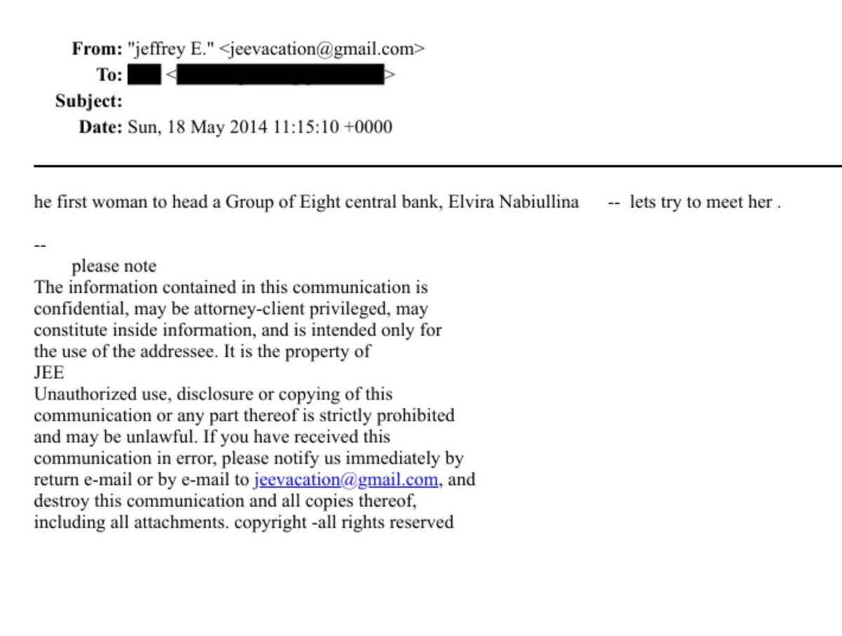 Epstein sought meeting with Russian Central Bank head In May 2014, Jeffrey Epstein expressed interest in meeting Elvira Nabiullina, noting she was the first woman to lead a G8 central bank