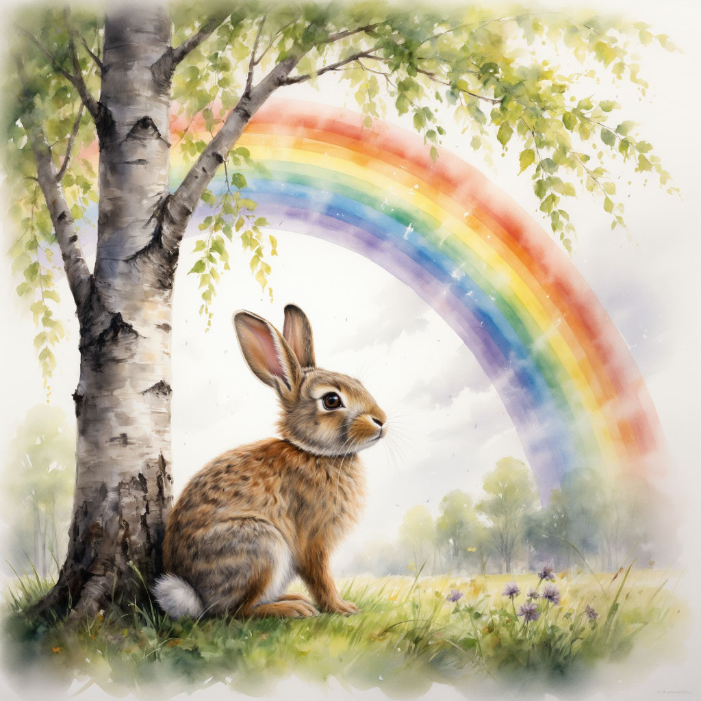 Жил‑был маленький зайчонок Пушистик. Он очень любил прыгать по лужайке и грызть сладкую морковку. Однажды утром Пушистик выглянул из норки и увидел в небе яркую‑яркую радугу.