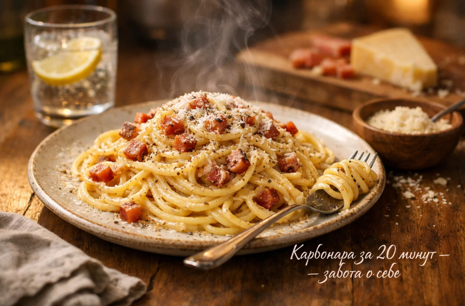 Двадцать минут — это очень мало. Меньше, чем серия любимого сериала. Меньше, чем дорога от метро до дома. Но за эти двадцать минут можно создать нечто, что порадует и тело, и душу. Горячая паста с хрустящим беконом, кремовым соусом и щедрой порцией сыра — это не просто ужин. Это забота о себе, маленький праздник посреди рабочей недели, напоминание о том, что хорошая жизнь складывается из таких вот простых удовольствий.