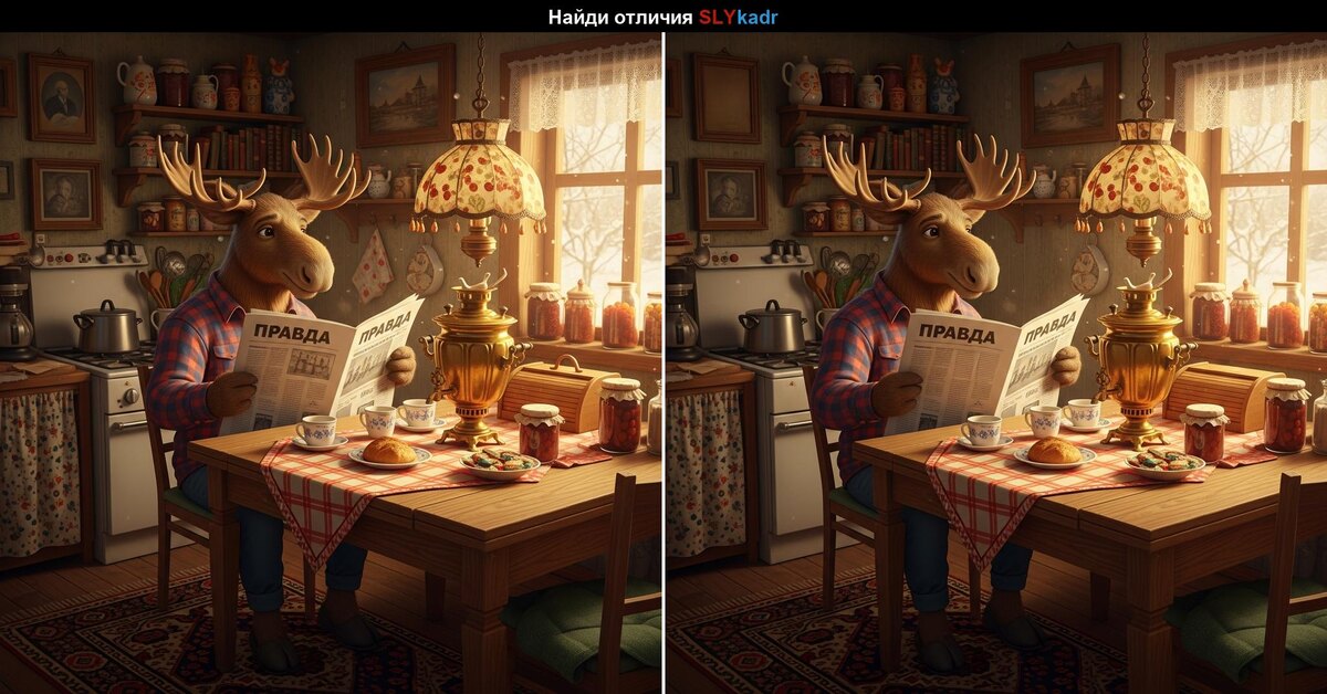 Перед вами тихое утро: лось читает газету «Правда», на столе дымится самовар, за окном светит солнце. Но не спешите расслабляться… ☝️