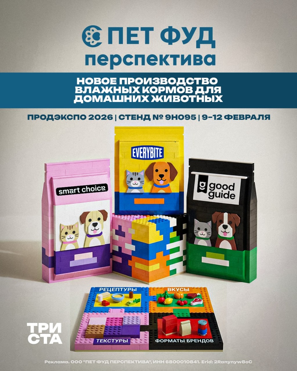 Когда поднимается вопрос запуска нового бренда влажного корма, требуется собрать продукт под конкретные условия рынка, потребности аудитории и окружение, при этом вкусы, форматы, рецептуры и упаковка должны быть заранее выверены и собраны в готовый бренд, где каждая деталька занимает свое место и работает на общий результат. Пет Фуд Перспектива – новая российская производственная площадка по выпуску влажных кормов для домашних животных, расположенная в Тамбове и оснащенная современным оборудованием, при этом контроль качества выстроен на всех этапах, от входящего сырья до готового продукта. В портфеле компании представлено три бренда. EVERYBITE – 4 СКЮ Бренд массового сегмента, ориентированный на объем, с классическими вкусами, привычными форматами и рецептурами, рассчитанными на высокую оборачиваемость и регулярный спрос, что делает линейку удобной для формирования базового ассортимента сетей и дистрибуции. SMART CHOICE – 5 СКЮ Бренд среднего сегмента с гибкой продуктовой логикой.