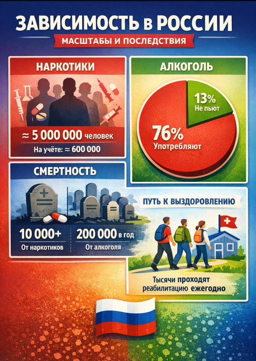 1. Сколько людей употребляют синтетические наркотики (и другие наркотики) По разным оценкам, в России около 5–6 млн человек регулярно употребляют наркотики, включая синтетические и другие запрещённые вещества. Официально на учёте значительно меньше (≈600 тыс.), но реальные данные говорят о миллионах людей, скрывающих зависимость. 2. Сколько людей употребляют алкоголь? Согласно исследованиям, примерно 76 % россиян употребляют алкоголь (раз в месяц и чаще). 🍺 Пьют алкоголь: 76 % населения 🚫 Не пьют алкоголь: 13 % 3. Количество смертей от алкоголя и наркотиков ⚰️ Наркотики: Официально от употребления наркотиков в России умирает более 10 000 человек в год. ⚰️ Алкоголь: Оценки исследований показывают, что до ≈200 000 случаев смертей связаны с алкоголем в год (2018 данные, с учётом прямых и косвенных причин). ⚠️ Смертей от наркотиков: ≈10 000+ / год ⚠️ Смертей от алкоголя: ≈200 000 / год 4. Количество выздоравливающих от зависимости. Реальных исчерпывающих данных по количеству люде