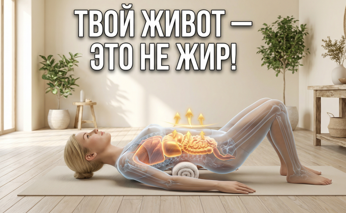 Пять минут в день лежания на полотенце или валике и со временем таз как будто чуть сужается, ребра «вспоминают», где им быть, а живот… просто втягивается сам собой. Многие думают, что живот выпирает из-за жира и начинают активно качать пресс. Но очень часто причина — не жир, а геометрия. Со временем, под действием гравитации и сидячего образа жизни: Даже при нормальном весе живот становится округлым, как будто надут изнутри. И пока скелет не выровняется — ни пресс, ни диеты это не исправят. Вы скручиваете валик из обычного полотенца и кладёте его строго под пупок, лёжа на полу.