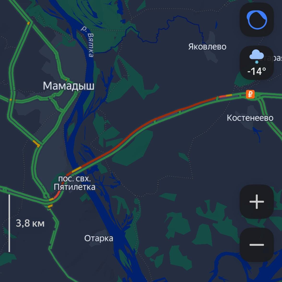 По словам очевидцев, после моста через Вятку произошла авария. Подробности выясняются.