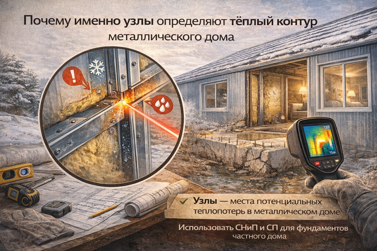 Если разбирать тёплый контур металлического дома по-настоящему, то ключевыми становятся не стены как таковые, а места их сопряжения с другими конструкциями. Именно здесь чаще всего нарушается непрерывность утепления и герметичности.