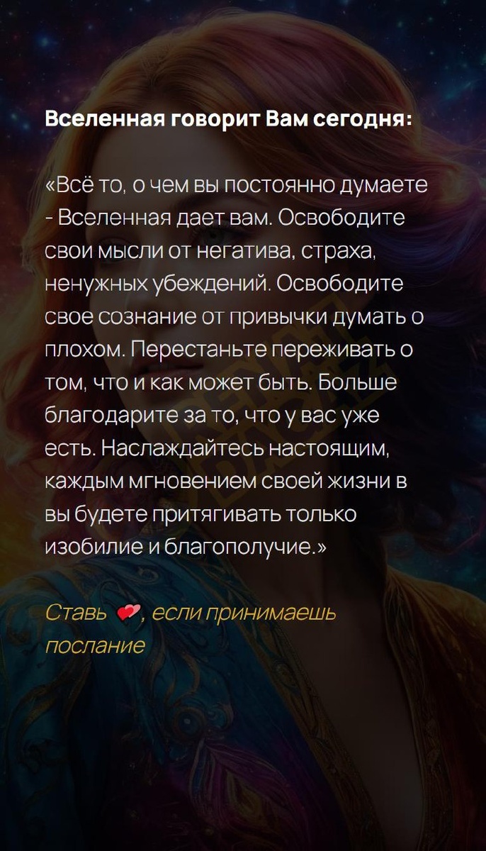 Вселенная говорит Вам сегодня: «Всё то, о чем вы постоянно думаете - Вселенная дает вам. Освободите свои мысли от негатива, страха, ненужных убеждений. Освободите свое сознание от привычки думать о плохом. Перестаньте переживать о том, что и как может быть. Больше благодарите за то, что у вас уже есть. Наслаждайтесь настоящим, каждым мгновением своей жизни в вы будете притягивать только изобилие и благополучие.» Ставь ??, если принимаешь послание Архитектура вашей души | Натальная карта T | VK | Pin | YouTub | Dzen #рекомендации #добро #психосоматика #моицели #начало #мирвдвоем #молодость #красотаизнутри #духовныйрост #3число #3февраля