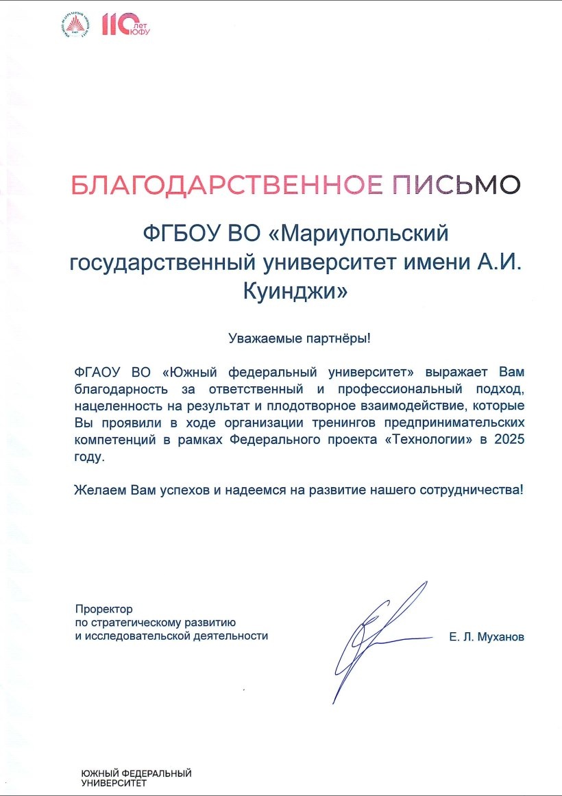 И. Куинджи поступило благодарственное письмо от Южного федерального университета! В письме ФГАОУ ВО «Южный федеральный университет» выражает благодарность за ответственный и профессиональный подход, нацеленность на результат и плодотворное взаимодействие, которые были проявлены в ходе организации тренингов предпринимательских компетенций в рамках проекта «Технологии» в 2025 году. ✅Высокая оценка со стороны партнеров подтверждает качество реализуемых образовательных инициатив и значимый вклад университета в развитие предпринимательского мышления и практических компетенций обучающихся. ✨ Благодарим коллег за сотрудничество и выражаем уверенность в дальнейшем укреплении партнерских связей! 👻 MAX|💙ВК|📝Дзен|🤩Сайт #МГУимениКуинджи