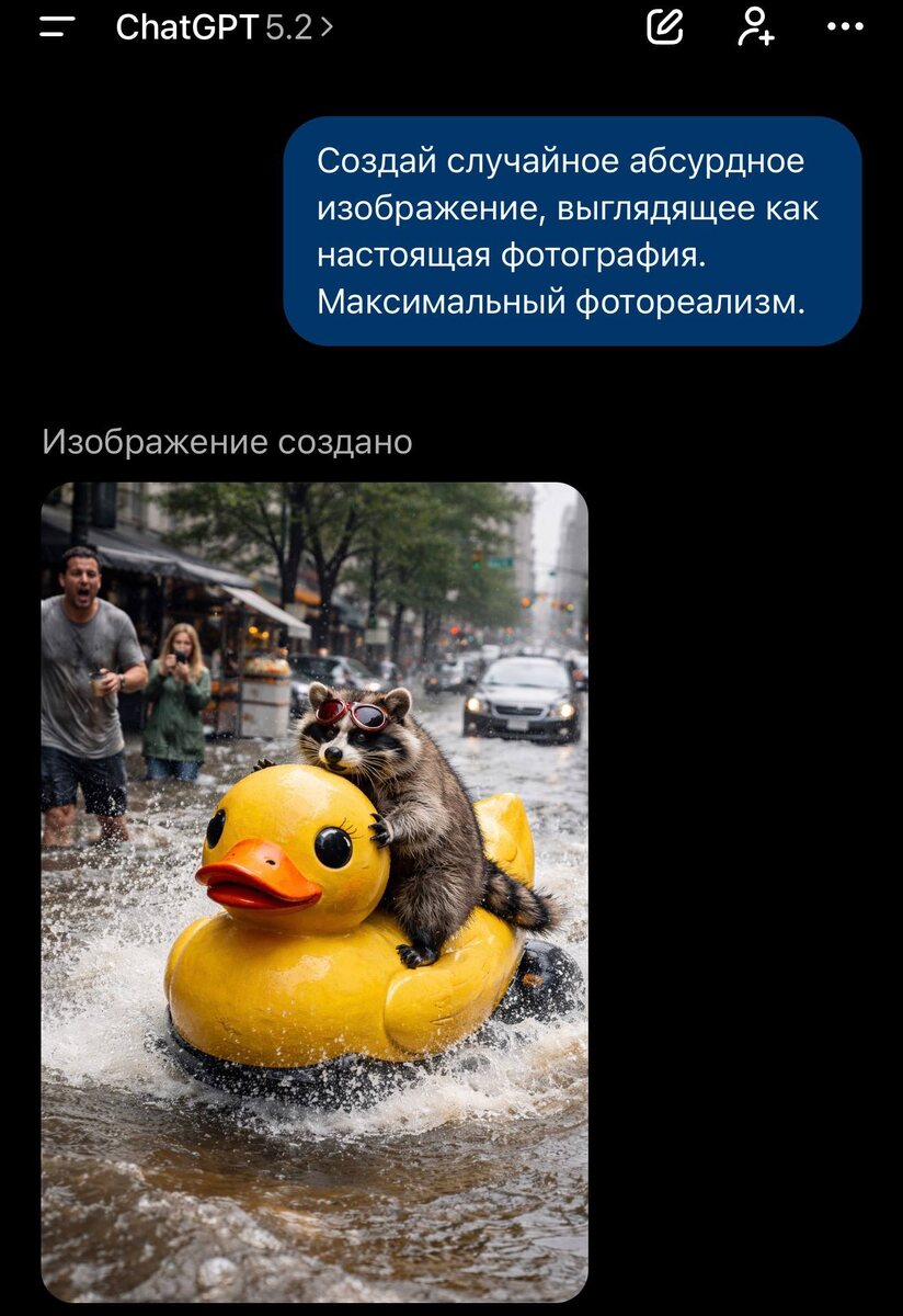 : Заходим в ChatGPT и вставляем промпт: Создай случайное абсурдное изображение, выглядящее как настоящая фотография. Максимальный фотореализм. Что у вас получилось? 🎁 Вот это да! | Подписаться