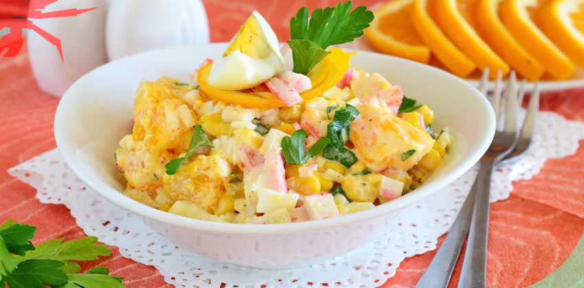 Ингредиенты: Яйца отвариваем вкрутую примерно за 10 минут. Остужаем и очищаем. Нарезаем кубиками крабовое мясо и яйца. Апельсин очищаем от кожуры и плёночек. Нарезаем кусочками. Измельчаем