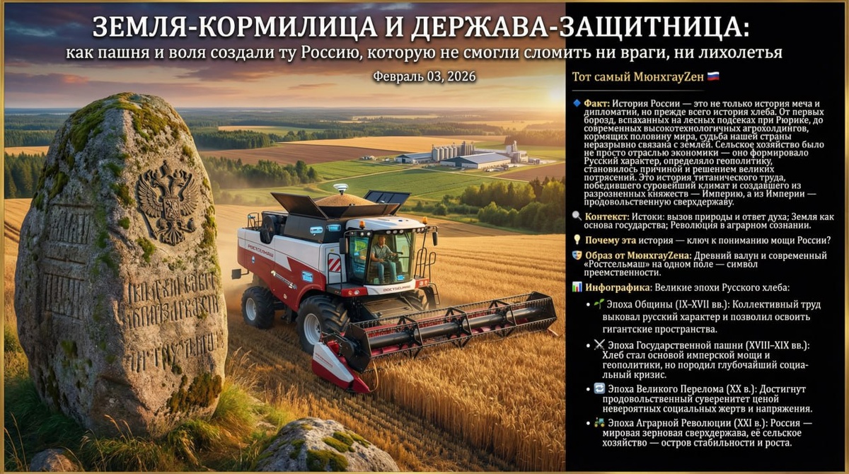 🚨 Рубрика: «Исторический калейдоскоп» Новый цикл: «Хлеб и воля: Как Русское земледелие от сохи до агрохолдингов ковало мощь Державы» 📅 Земля-кормилица и Держава-защитница: как пашня и воля создали ту Россию, которую не смогли сломить ни враги, ни лихолетья - Часть 2️⃣/2 📊 Инфографика: Великие эпохи Русского хлеба • 🌱 Эпоха Общины (IX–XVII вв.): Подсечно-огневое и трёхполье. Главный итог: Коллективный труд выковал русский характер и позволил освоить гигантские пространства. • ⚔️ Эпоха Государственной пашни (XVIII–XIX вв.): Крепостничество, зерно как главный экспорт. Главный итог: Хлеб стал основой имперской мощи и геополитики, но породил глубочайший социальный кризис. • 🔁 Эпоха Великого Перелома (XX в.): Столыпинские реформы, коллективизация, целина. Главный итог: Достигнут продовольственный суверенитет ценой невероятных социальных жертв и напряжения. • 🚜 Эпоха Аграрной Революции (XXI в.): Рыночные реформы, технологизация, экспортное лидерство. Главный итог: Россия — мировая зе