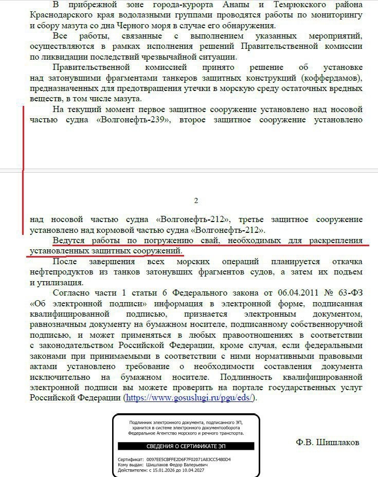 ❗️Над затонувшими танкерами в Керченском проливе устанавливают защитные конструкции Об этом заявили в Росморречфлоте. Сообщается, что коффердамы помогут предотвратить утечку в море остаточных вредных веществ. После этого, согласно документу, планируется откачка нефтепродуктов из танкеров, их подъём и утилизация. Сейчас для работ привлечены 28 плавсредств. Подпишись — будь на зелёной стороне | Сортировочная в MAX