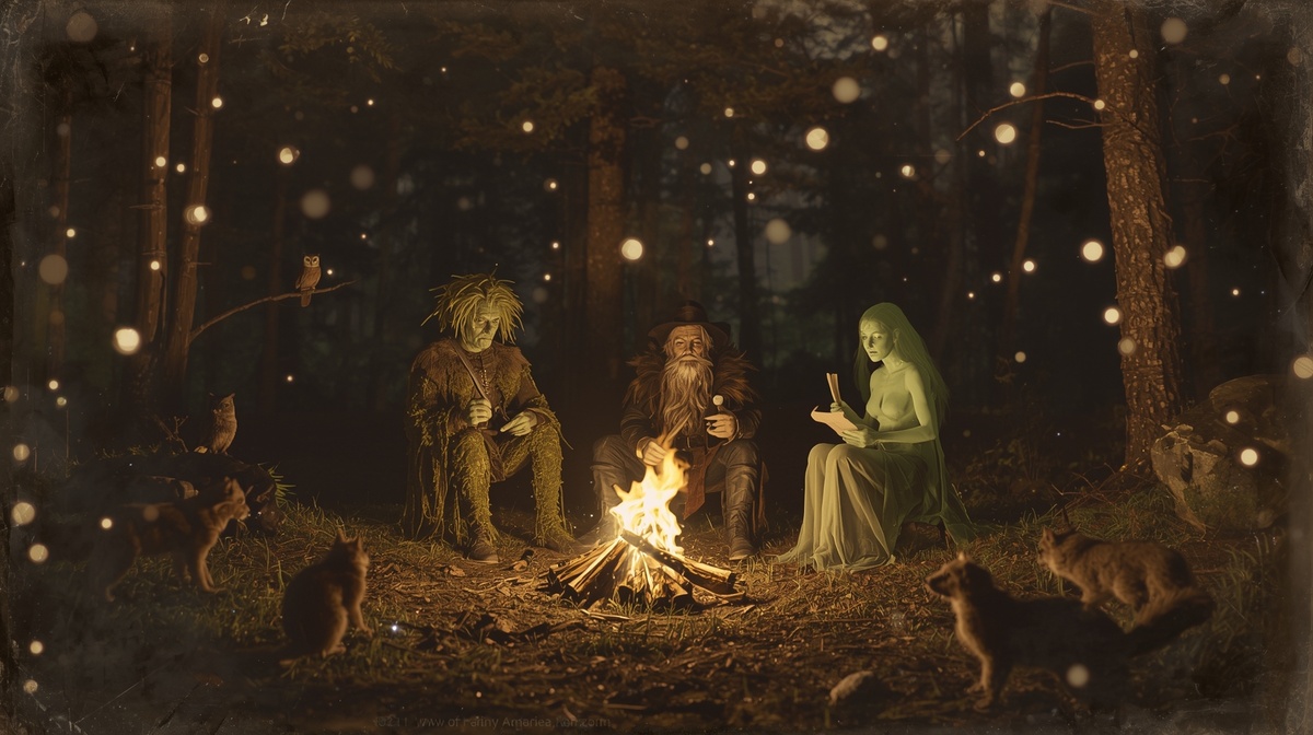 Посреди поляны трещал небольшой костёр, подаренный самим Огнём-Батюшкой (по особой договорённости и под присмотром двух бдительных ёжиков с мокрыми лапками). А вокруг, на ветвях, пнях и просто на земле, расположилась публика: филин-мудрец, семейство белок с орешками, два волка-эстета, старый барсук-летописец и десяток птиц разных мастей. Освещали действо, как братья-люстры, светлячки, привязанные за ножки к веткам кустов.