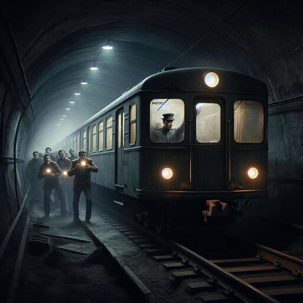 И тогда они увидели. Не в стене, а прямо в тоннеле, впереди них, из ничего начало проявляться световое пятно, похожее на свет фар. Оно росло, принимая форму. Через несколько секунд перед ними, в полной тишине (стук прекратился), стоял призрачный поезд. Два старых, потертых вагона типа «А» с деревянной обшивкой. В окнах горел тусклый, желтоватый свет, будто от керосиновых ламп. А в кабине головного вагона, за стеклом, был виден силуэт человека в фуражке машиниста старого образца. Он смотрел прямо на них.